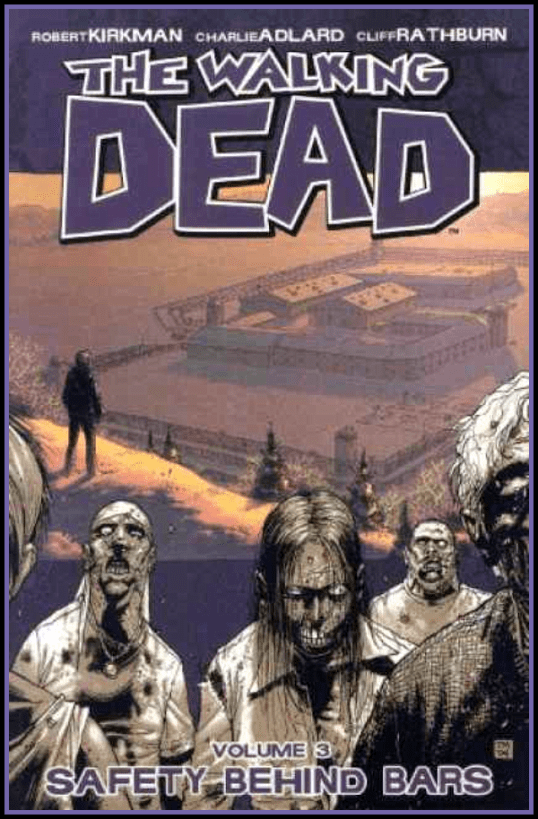 Safety Behind Bars is the third collected volume of Robert Kirkman’s excellent The Walking Dead comic book series from Image Comics. This volume collects issues 13 through 18 and it continues that journey and travails of surviving in a world overrun by the undead. As the tagline of the books proclaim, in a world ruled by the dead we are forced to finally start living. This is so true in Safety Behind Bars as Kirkman and returning artist Charlie Adlard tell the story of Rick Grimes and his band of survivors as they come across what they think will be their salvation from the threat of the hungry dead: an abandoned prison complex.
