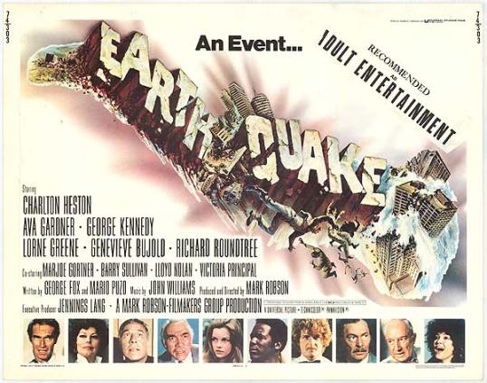 So, Earthquake is one of those movies from the 70s in which a large group of different characters had to deal with some sort of cataclysmic disaster that could, in theory, have happened in reality as well as up on the movie screen. There were apparently about 2,000,000 of these films made between 1970 and 1980 and they all had titles like Hurricane, Tornado, Big Fire, Asbestos, Flash Flood, Lava Flow, Khardashian, Avalanche, and, of course, Earthquake. These movies always featured an “all-star” cast of people that nobody had ever actually heard of and I guess part of the fun was trying to guess who would survive and who would die. Apparently, they were the 1970s version of Dancing With The Stars. Call it Dying With Celebrities.