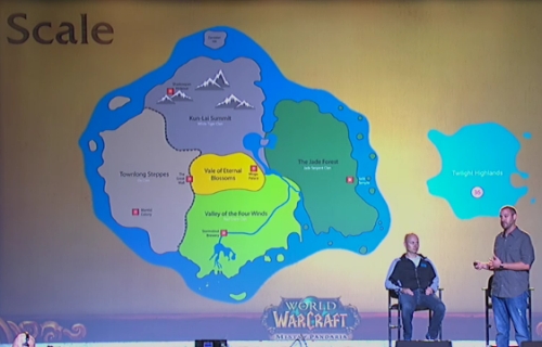 But there are a number of features to take into consideration. This scale compares Pandaria’s five zones on the left to Twilight Highlands on the right. Twilight might not seem that big, dashing around with master riding skill and the like, but if you expand your in-game map you’re going to realize Pandaria is well over half the size of Eastern Kingdoms. And there is a further catch: You can’t fly there until level 90.
