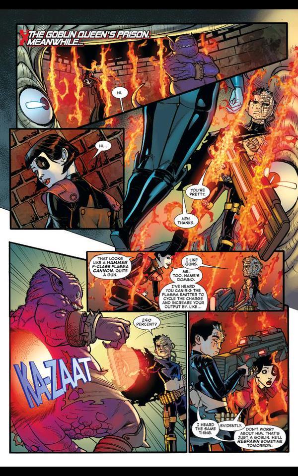 If Inferno Nate survives Secret Wars, I hope that he takes a page from Odin’s book and sacrifices an eye to gain some Goblin powers.  As the result of this sacrifice, his formerly cybernetic scars would take a more monstrous/goblin appearance.  In addition to this disfigurement, the T-O virus would be restricted to his left eye, granting it enhanced sensory abilities.  As a nod to his father, he would fire telekinetic/mystical blasts from that eye.  I also see Inferno Nate becoming a pupil of Doctor Strange like Magik.