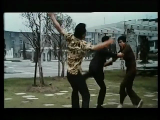 this guy in red needs help protecting Dr. T and his daughter. I’m quite sure it’s Bruce Li, but I’m not sure if he was one of the Supermen at the beginning or not. Doesn’t matter because in the next scene Dr. T is getting kidnapped and shoved in a car. In a car that’s passing, the two guys above spot the car and give chase. A long slow car chase.