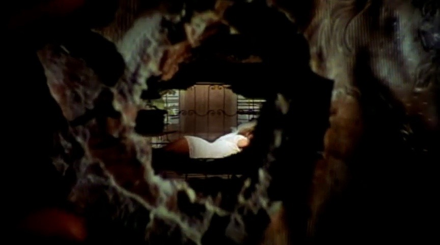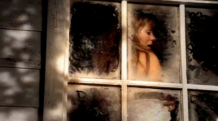 Then we begin our trip into the house through the Baby Doll inspired hole-in-the-wall. You can just barely see the man’s finger in the lower lefthand-corner as the camera moves forward to show us Carey on a bed with a rocking horse behind it. Then, in a split-second, we see Carey get a small smile on her face. That is followed by a shot of her legs that, along with everything else about the shot, indicates to us that she is an attractive person that is cooped up in this house in bed like she is a baby in the safety of her crib. Then the lyrics kick in, we start to get to know her, and begin her journey.