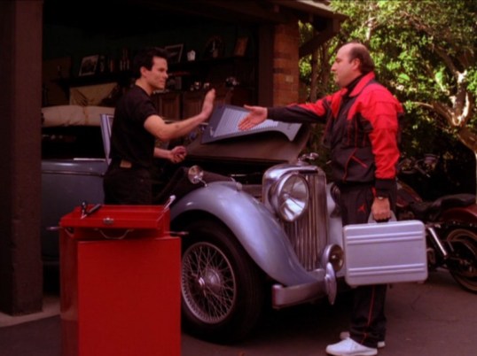 At the Marsh place, James is working on another one of classic cars when Jeffrey Marsh (John Apicella) walks up and introduces himself. He says that he’s envious of James’s carefree lifestyle. He says that he’d love to talk to James about the cars later in the day but James says that he should probably be moving on. Evelyn (Annette McCarthy) walks up and says that she is sure that she can find all sorts of things for James to do around the house. James walks back inside the garage and Jeffrey drives away in the car that James just finished working on. As Evelyn looks off in the distance, there is the sound of screeching tires and a car crash.