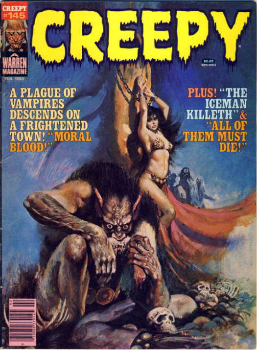Illustrator Frank Frazetta (1923-2010) is well known among fans for his brilliant artwork in the fantasy/horror/sci-fi genres, especially his covers for the paperback reissues of CONAN THE BARBARIAN in the 60’s. Frazetta did a lot of covers for Warren Publications’ black and white horror comic line, and here is a gallery of his work from the covers of CREEPY: