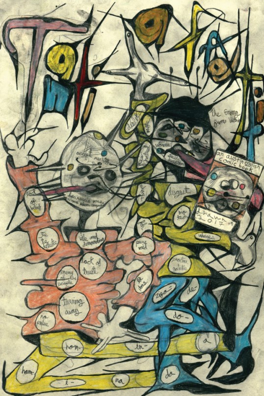 Not as hard as the cartoonist who made them, of course — and Austin English busted his tail (and his hands, and probably even his brain) on his latest solo book, The Enemy From Within, published in late 2017 by Sonatina Comics. The sheer effort that went into the creation of the thematically-linked triptych of stories (the titular “The Enemy From Within, ” “Half-Hearted Slogan Dance,” and “Solo Dance #2”) is apparent on all 22 of these intricately-detailed, insanely imaginative pages. English uses every last millimeter of space available to him, his images densely packed from corner to corner, side to side, negative space a luxury he can seldom afford. He’s clearly got a lot to say — but what is it?