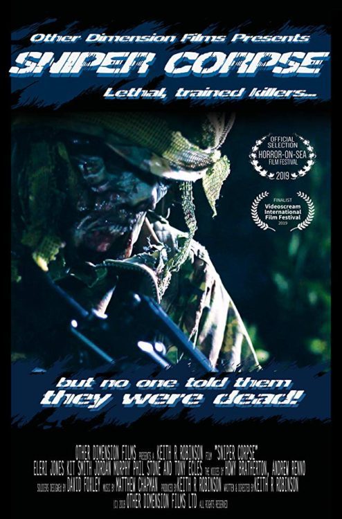 Coming our way from the UK in 2018 and “boasting” a production budget of 30,000 pounds, writer/director Keith R. Robinson’s Sniper Corpse (now available for streaming on Amazon Prime under the closely-related title of Corpse Sniper — I honestly couldn’t tell you if it’s seen a Blu-ray or DVD release) has precisely one chance to make it : put succinctly, it absolutely needs to punch above its weight class.