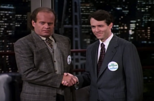 Fraiser’s father, Martin (John Mahoney, how we miss you!) had already filmed a commercial for Thorpe, one in which he said that his career as as a cop was ended by the type of criminals that would be released on the streets if a bleeding heart like Phil Patterson was elected. Hoping to counter their father’s endorsement, Frasier and his brother, Niles, arranged to film a commercial for Phil Patterson right in Frasier’s apartment.