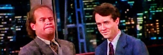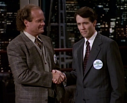 Fraiser’s father, Martin (John Mahoney, how we miss you!) had already filmed a commercial for Thorpe, one in which he said that his career as as a cop was ended by the type of criminals that would be released on the streets if a bleeding heart like Phil Patterson was elected. Hoping to counter their father’s endorsement, Frasier and his brother, Niles, arranged to film a commercial for Phil Patterson right in Frasier’s apartment.
