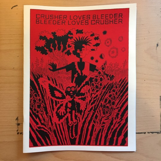 Spoiler alert : he’s actually a mutant quasi-anthropomorphic fuzzy mosquito (or something), so his lust for the red stuff is just as natural as breathing is to you or me. But maybe we’re putting the cart before the horse by pondering the (somewhat) philosophical questions at the heart of writer Thomas Stemrich and artist Patrick Keck’s new full-sized (and, for the record, self-published) comic ‘zine Crusher Loves Bleeder Bleeder Loves Crusher #1 prior to considering the work on its technical merits? I guess we are.