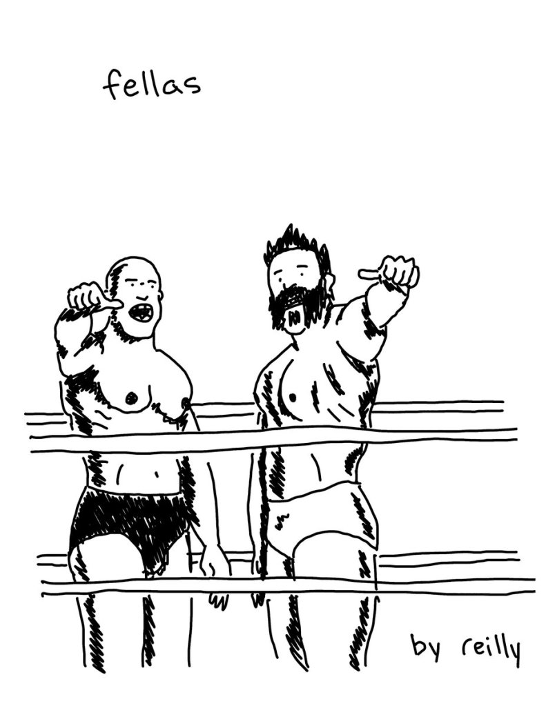 I’m quite likely the least-qualified person to write a review of Reilly Hadden’s new self-published mini, Fellas, given that I know precisely fuck-all about professional wrestling, but at the same time there’s something kind of undeniably sweet about this thing, and Hadden (whose Kricket The Cat strip, by way of full disclosure, runs regularly on a website I serve on the board of — that being, of course, SOLRAD) is a superb cartoonist, so why let a pesky little thing like not knowing what the hell I’m talking about stop me from running my mouth?
