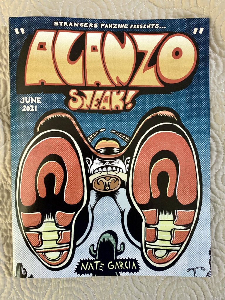 Any way you slice it, Philadelphia cartoonist Nate Garcia’s Alanzo Sneak is an impressive package — richly drawn, published in an oversized magazine format by your friends and mine at Strangers fanzine (who, it has to be said, are absolutely killing it since venturing into the world of comics publishing), and thoroughly conceptualized, this is a comic that fires on all cylinders and bears all the hallmarks of autuer work, with production values to match the quality of its visual storytelling. From the minute you see those “Ben Day Dot”-style cover colors accentuating the absolutely wild sense of proportion Garcia brings to his titular protagonist, you know you’re in for a wild ride that engages both eyes and mind. I honestly have to ask myself : how can this guy only be nineteen years old?