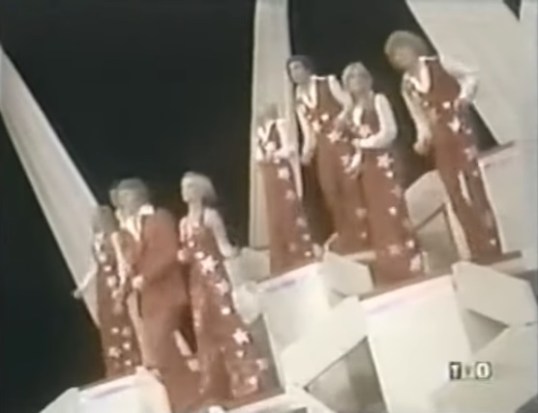 I’ve discovered that the dancers who performed on each episode of The Brady Bunch Hour were known as the Kroftettes. (The show as produced by Sid and Marty Kroft and there is definitely nothing creepy about naming your performers after yourself.) The second episode of the Brady Bunch Hour opened with the Kroftettes dressed in red, white, and blue and carrying small drums. It would be a perfect look for the 4th of July but this episode aired in January.