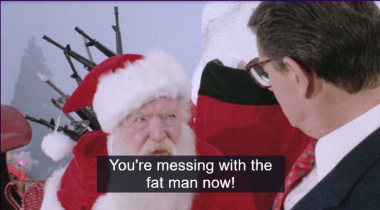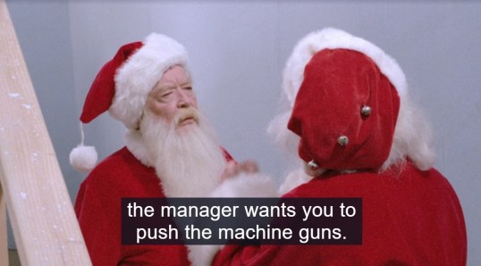 Santa says that there’s no way he’s going to push machine guns. He’s about peace and love! His boss, Mr. Grinchley (Robert Casper), threatens to fire him. Santa doesn’t react well to that.