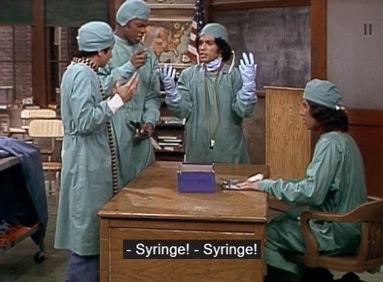 Anyway, it turns out that Florence the Hamster is pregnant and this somehow leads to all of the Sweathogs donning surgical scrubs while Forence gives birth in Gabe’s classroom.