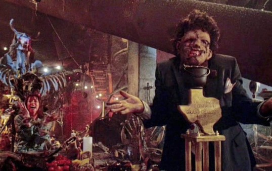 Yes, Leatherface and the entire family are back. When last seen at the end of 1974’s The Texas Chainsaw Massacre, Leatherface was dancing with his chainsaw while the morning sun shined down on the Texas countryside. Now, he and the family have moved to North Texas and the eldest brother, Drayton Sawyer (Jim Siedow), has become a bit of a local celebrity due to his chili. (Everyone loves Drayton’s chili but that’s mostly because they don’t know who the main ingredient is.) Though one of the brothers was killed at the end of the original film, he’s been replaced by the manic Chop-Top (Bill Moseley), who has a metal plate in his head. Of course, Grandpa (Ken Evert) is still alive. He’s well over a hundred years old but he still enjoys trying to wield a hammer.