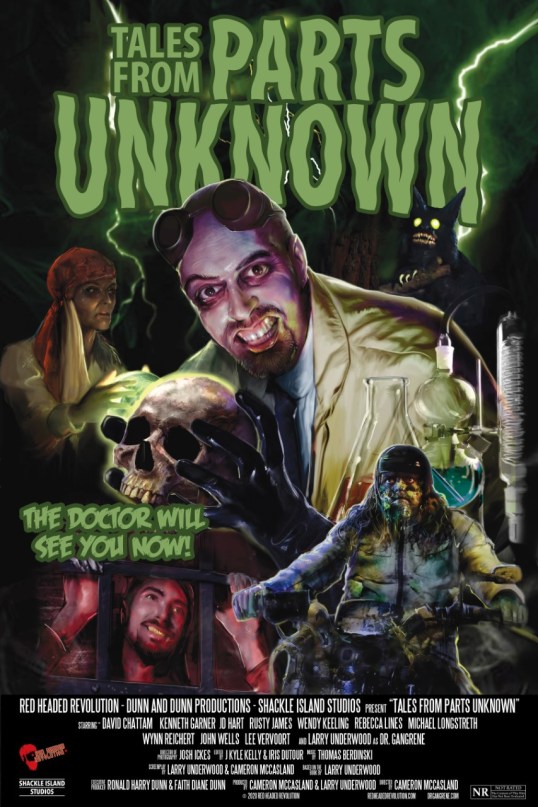 On Shackle Island, there’s a somewhat dilapidated-looking mansion. And inside that mansion, there’s a friendly and talkative scientist by the name of Dr. Gangrene (played by Larry Underwood). If you need shelter from the rain, Dr. Gangrene will be more than happy to accommodate you. Of course, if you do accept Dr. Gangrene’s hospitality, you’ll have to visit the lab and take a look at the doctor’s truly impressive collection of brains. For every brain, there’s a different story. In the new horror anthology film, Tales From Parts Unknown, Dr. Gangrene introduces four of those stories.