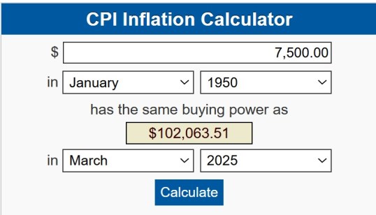 That definitely caught my attention. “I make more than that!” I snapped at the screen. I pulled up an inflation calculator and I discovered that $7,5000 in 1950 is the equivalent of — wait for it — $102,000 today! (Technically, I still make more than that but still, it’s six figures.)