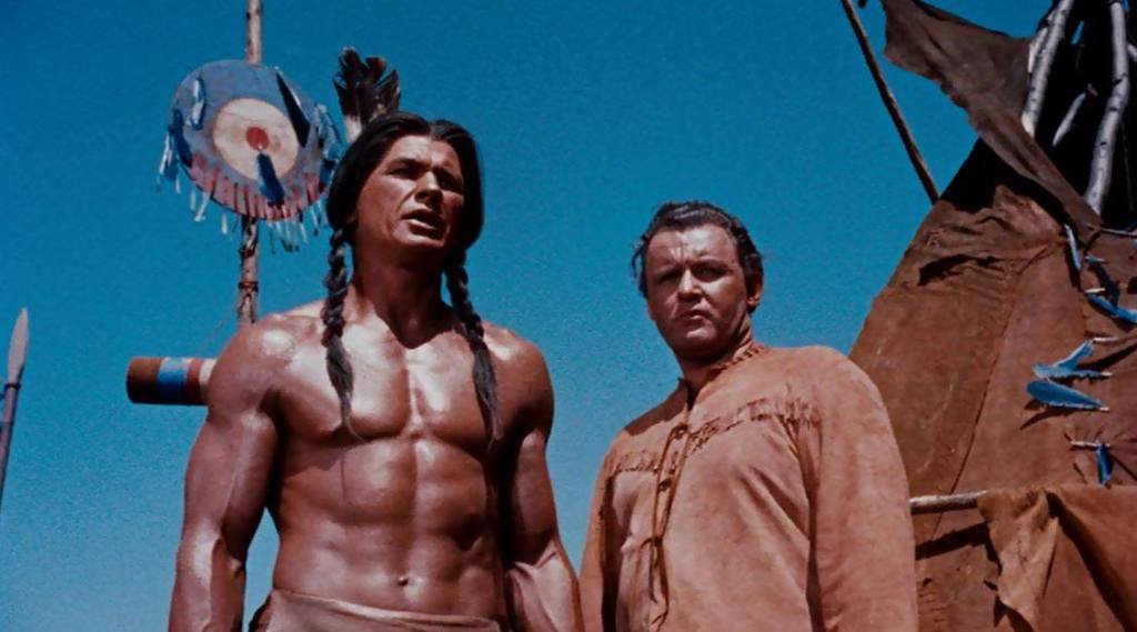Some of the performances are very effective in the film. Rod Steiger’s Irish, confederate Sioux is an interesting character and the actor gives it his all as you’d expect. I’m a big fan of Steiger and his performance here only solidifies my respect for him. Brian Keith’s Captain Clark arrives fairly late in the proceedings and comes across as a tough, but honest man of integrity at a point when the movie really needs him. He has an excellent scene with Steiger where he debates the old confederate’s reasons for renouncing his citizenship with both sound logic, empathy, kindness and a hint of likable sarcasm all at the same time. It’s one of the best scenes in the film. And likewise, Charles Bronson, the most buff Hollywood Indian to ever strip down to a loincloth, comes across as a reasonable and kind tribal chief in his dealings. Bronson had played Indians before, but he was usually more of the renegade, warpath variety, so it was nice seeing him as a good guy here. H.M. Wynant took the renegade Indian role here which you might have expected for Bronson at the time. He’s suitably fierce but one-dimensional. The same can be said for Ralph Meeker as Lieutenant Driscoll. He’s pretty much just a stereotypical jerk. He’s good at being a jerk though! And Sarita Montiel, voiced by Angie Dickinson, is quite the beauty as Yellow Moccasin. We discussed H.M. Wynant and RUN OF THE ARROW with author Steven Peros on the “This Week in Charles Bronson Podcast.” Check out that interview below:
