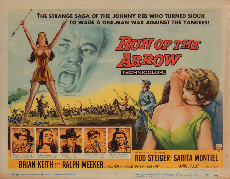 RUN OF THE ARROW opens up on April 9th, 1963, with confederate sharpshooter O’Meara (Rod Steiger) shooting a Union lieutenant named Driscoll (Ralph Meeker). This turns out to be the final shot fired in the Civil War as General Lee is in the process of surrendering to General Grant. It also turns out to be Driscoll’s lucky day, as a slight warping of the bullet causes O’Meara’s aim to be off just enough for him to survive. With no more war to fight and with a heart full of hate for the Yankees, O’Meara declares himself to be a man without a country and decides to head out west towards the land of the Indians. As part of his travels he happens across Walking Coyote (Jay C. Flippen), an aging, renegade Sioux scout who’s headed back home to die. Walking Coyote takes O’Meara under his wing and teaches him the Sioux language, as well as many of their customs. When they’re captured by a band of Sioux warriors led by Crazy Wolf (H.M. Wynant), and are being prepared to be killed, Walking Coyote invokes the “run of the arrow”, a ritualistic game that could save their lives. Unfortunately, no one has ever survived the run of the arrow. But today, it seems there’s a first time for everything, as O’Meara survives just long enough to be found, hidden, and saved by the beautiful Indian squaw Yellow Moccasin (Sarita Montiel). Yellow Moccasin nurses him back to health and presents him to her tribal chief, Blue Buffalo (Charles Bronson), who spares his life since he survived the run. Blue Buffalo also welcomes O’Meara into their tribe and allows O’Meara and Yellow Moccasin, who have fallen in love, to get married and adopt the mute orphan boy, Silent Tongue, as their own son. Things seem to be going well until Sioux Leader Red Cloud (Frank DeKova) and Army General Allen (Tim McCoy) reach an agreement that allows for an Army Fort to be built in a narrowly defined area. While the construction of the fort is entrusted to an honest man of integrity named Captain Clark (Brian Keith), the agreement is ultimately sabotaged by the murderous Crazy Wolf, and then further by the Indian hating Captain Driscoll… yes, that same Union soldier that O’Meara shot on the last day of the war! When the fighting starts again, will O’Meara prove himself to truly be a Sioux warrior willing to kill American army soldiers, or is a part of his heart still with his country?