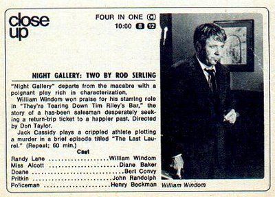 The first season of Night Gallery came to a conclusion on January 20th, 1971. Though the first season was undoubtedly uneven, it did end on a high point. The first segment in the 6th episode, They’re Tearing Down Tim Riley’s Bar, is widely considered to be the best episode of Night Gallery and one of Rod Serling’s best teleplays. It also brought Night Gallery one of it’s few Emmy nominations when it was nominated for Outstanding Single Program of the year. (It lost to The Andersonville Trial, a theatrical adaptation that was produced for PBS.)