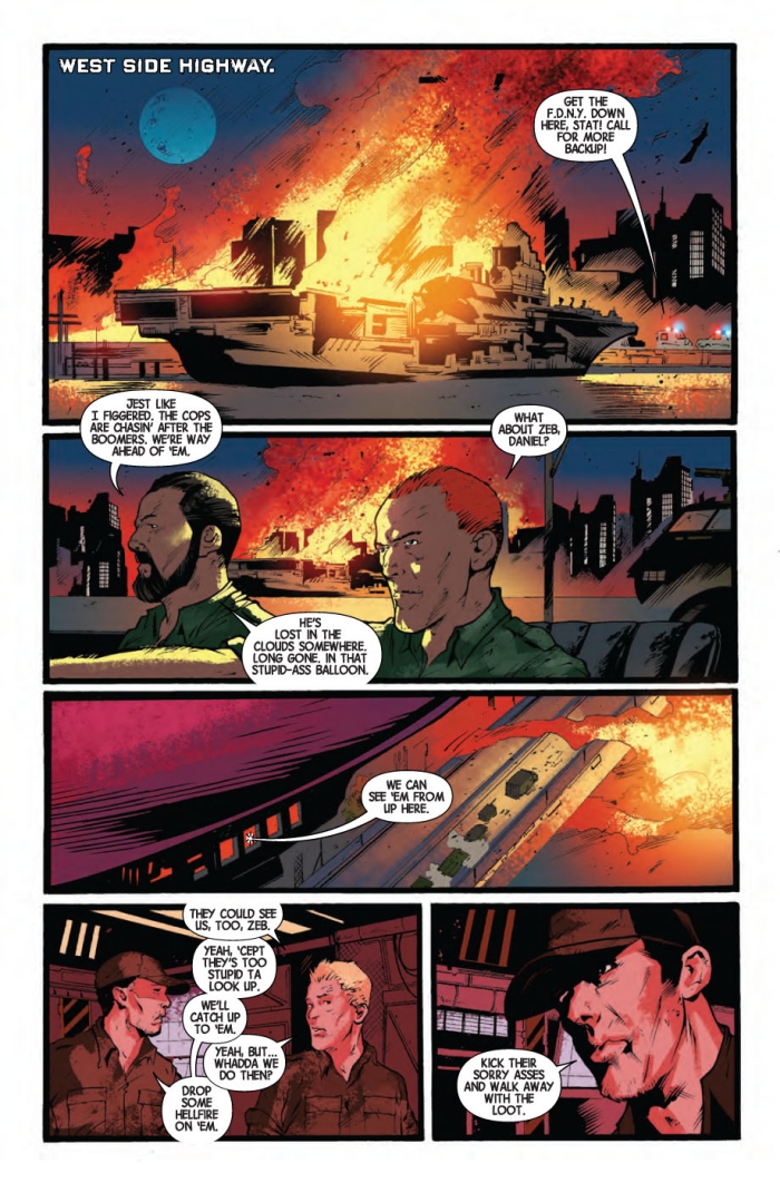 Please allow me to explain since you, dear reader, deserve at least that much : a good number of plotlines actually wrapped themselves up last issue (the aerial bombardment of New York, the fall of the vampire ruling class, the daring raid on the Federal Reserve, the final fate of characters like Dixie Peach and Lilith), so the only remaining order of business here is for Paul, Penny, and Xavier to rescue “street urchin” Joe and the other kids from the “blood farm” they’ve been shipped to that was discovered by Detective Perez. Which they do in rather spectacular fashion thanks to an all-out invasion courtesy of an army of zombies that has bused in specifically for the occasion. It’s fun, it’s action-packed, it’s well-illustrated by Andrea Mutti with help from inker Roberto Poggi, and Romero’s script is a reasonably compelling little page-turner. But —-