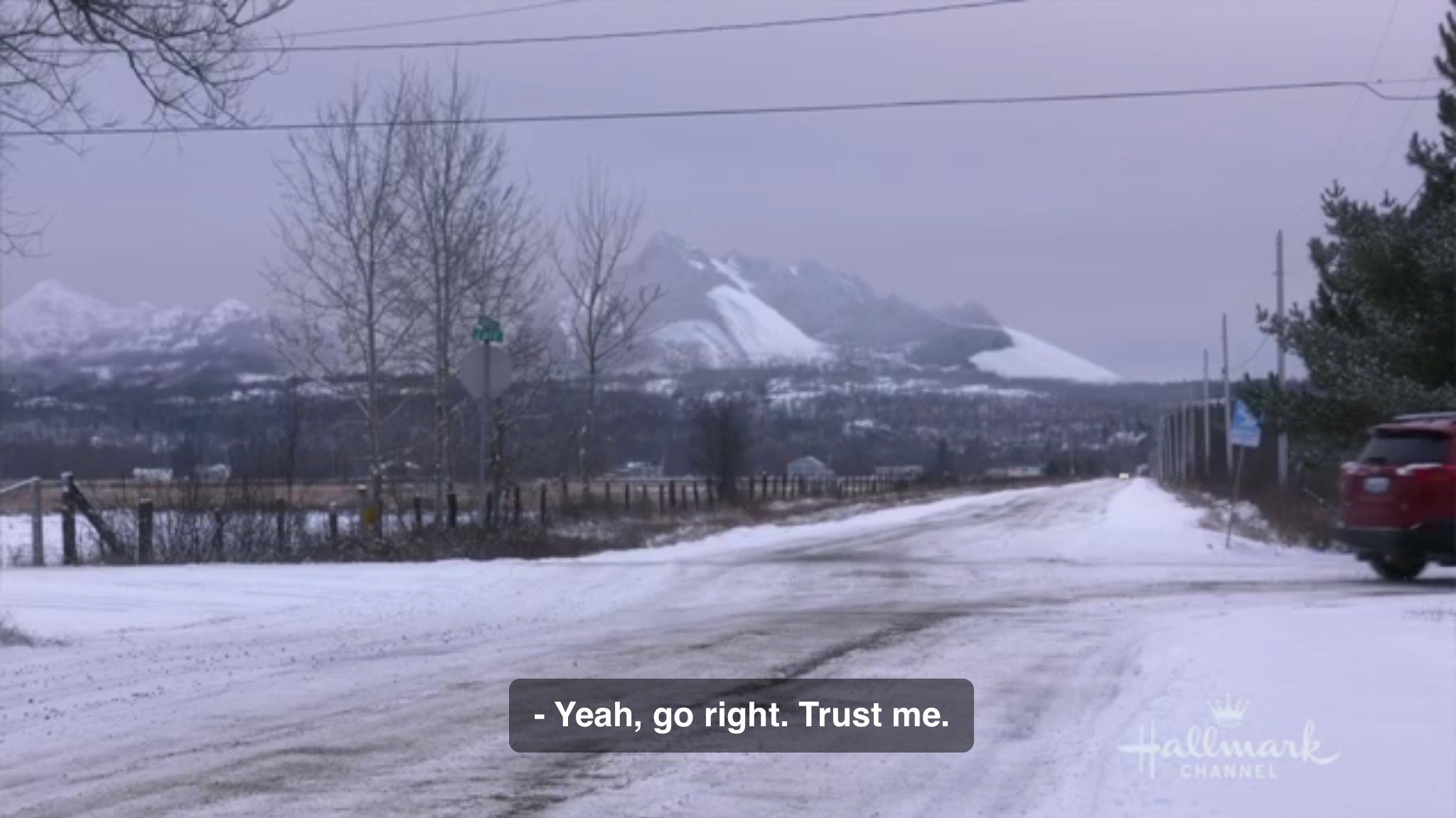This means we get a shot of a plane and driving on one of those beautiful highways that take you through the mountains. Makes me long for the days when I used to take trips to Lake Tahoe with my parents. Then Sydney tells Julia that the GPS says turn right.