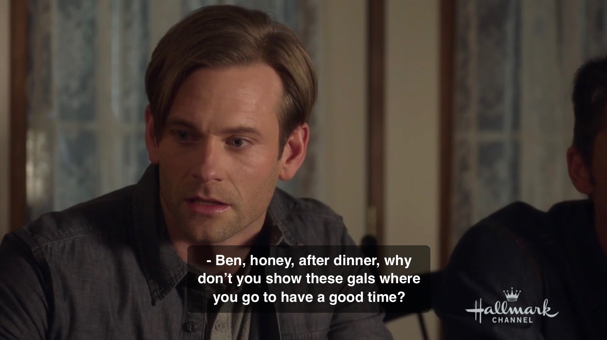Now we have a surprisingly normal conversation around the dinner table. We even find out that Ben wants to make the place a dude ranch. Seems like a great idea to me. He’s quite enthusiastic about it actually. One of the great things about living even next door to San Francisco in a suburb, I can’t tell you how wonderful it is to be able to go only a few miles and encounter endless parks. Even if places like “Destiny Ridge Ranch” aren’t somewhere you’d want to live, they are great places to visit and help to support the people who do want to live there. However, Sydney stumbles upon something that I guess Ben didn’t think of. That being the question of what are these people going to do at night. All the activities he lists are daytime ones. I can honestly see Ben completely missing that himself. Given where he lives he must be exhausted come night time and probably checks out early to sleep. However, this is when mom chimes in and things start to get weird.