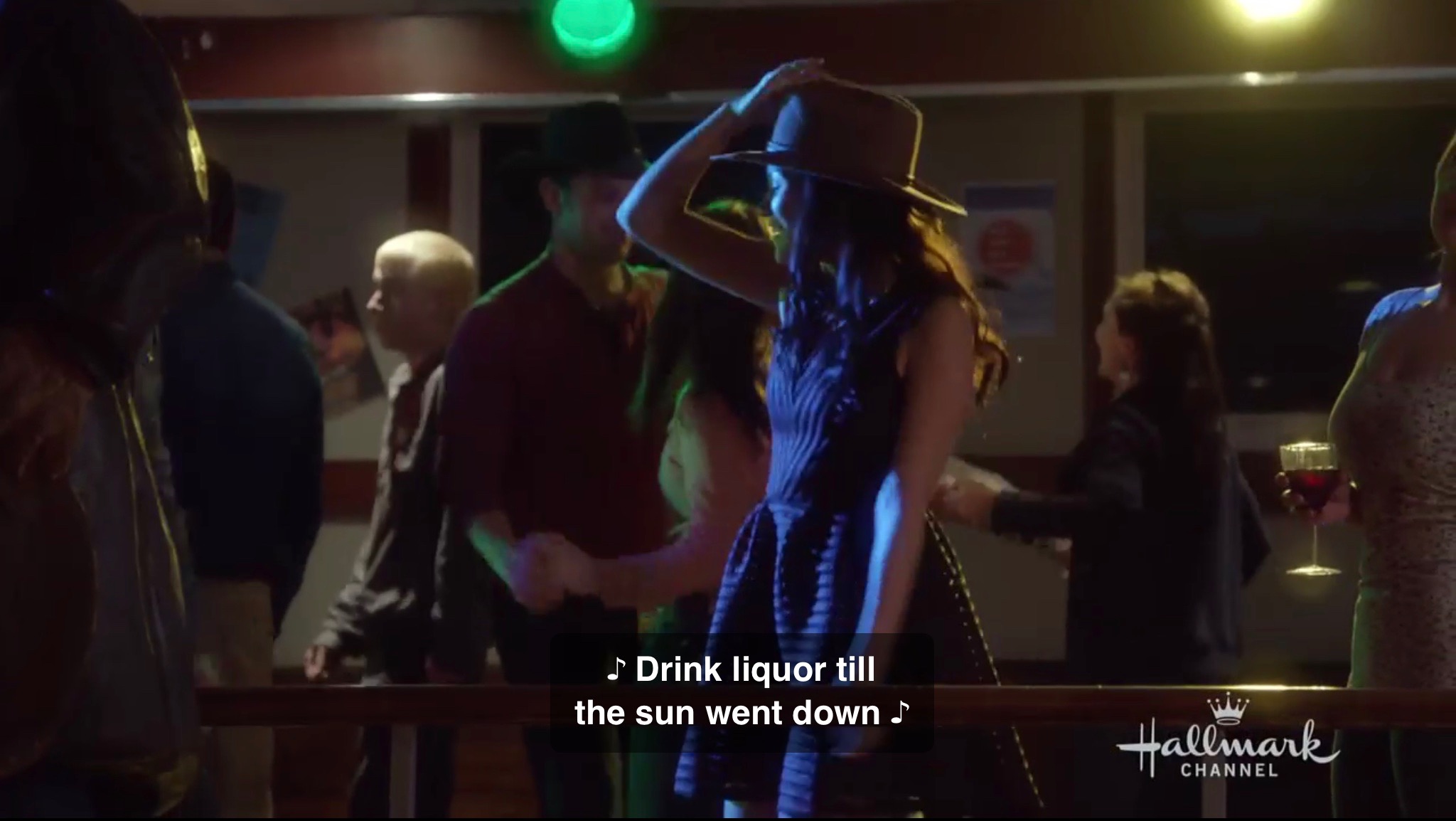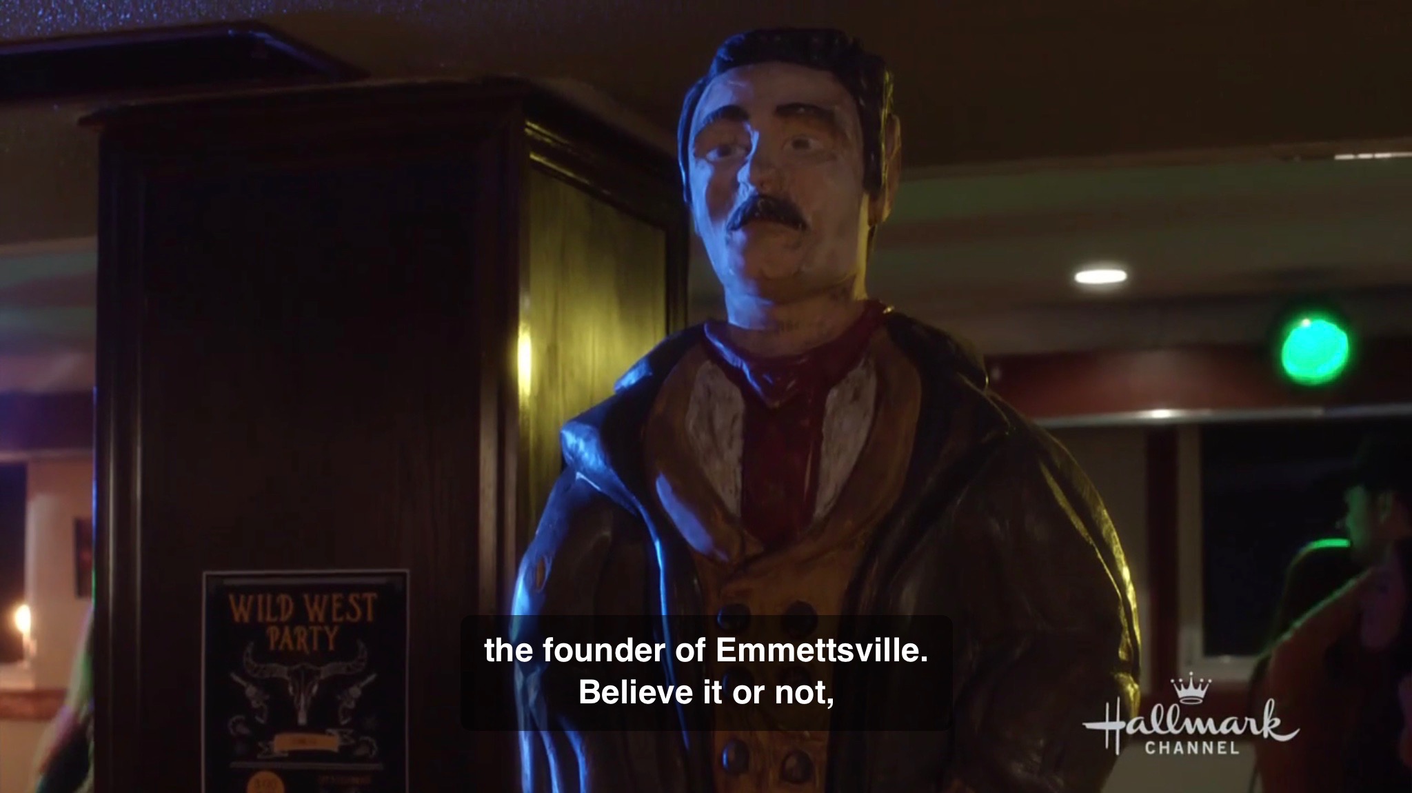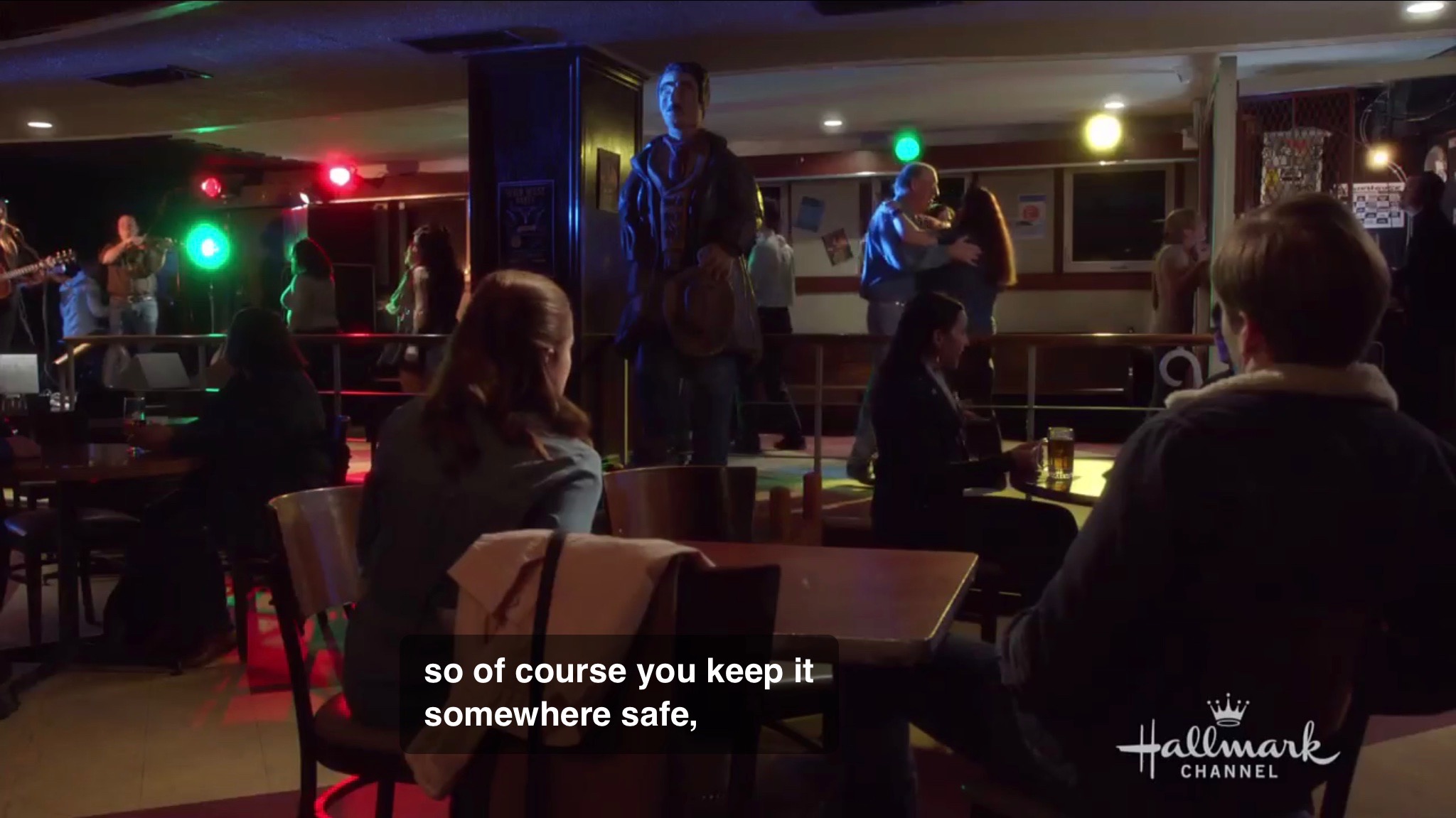 Seems innocent enough. He tells them “it’s a little different than the bars you’re used to.” Doesn’t seem that different to me. We see a waitress serving alcohol. There’s pool tables. There’s live music. There’s a dance floor. I guess because the live music is country music? Definitely a stereotype, but he’s kind about it. He doesn’t call them hicks or drop lines about Italian boots like Autumn Reeser did in the film A Country Wedding. Sydney makes a beeline for the dance floor and Julia sits down at a table with Ben. She takes notice of a statue in the bar.