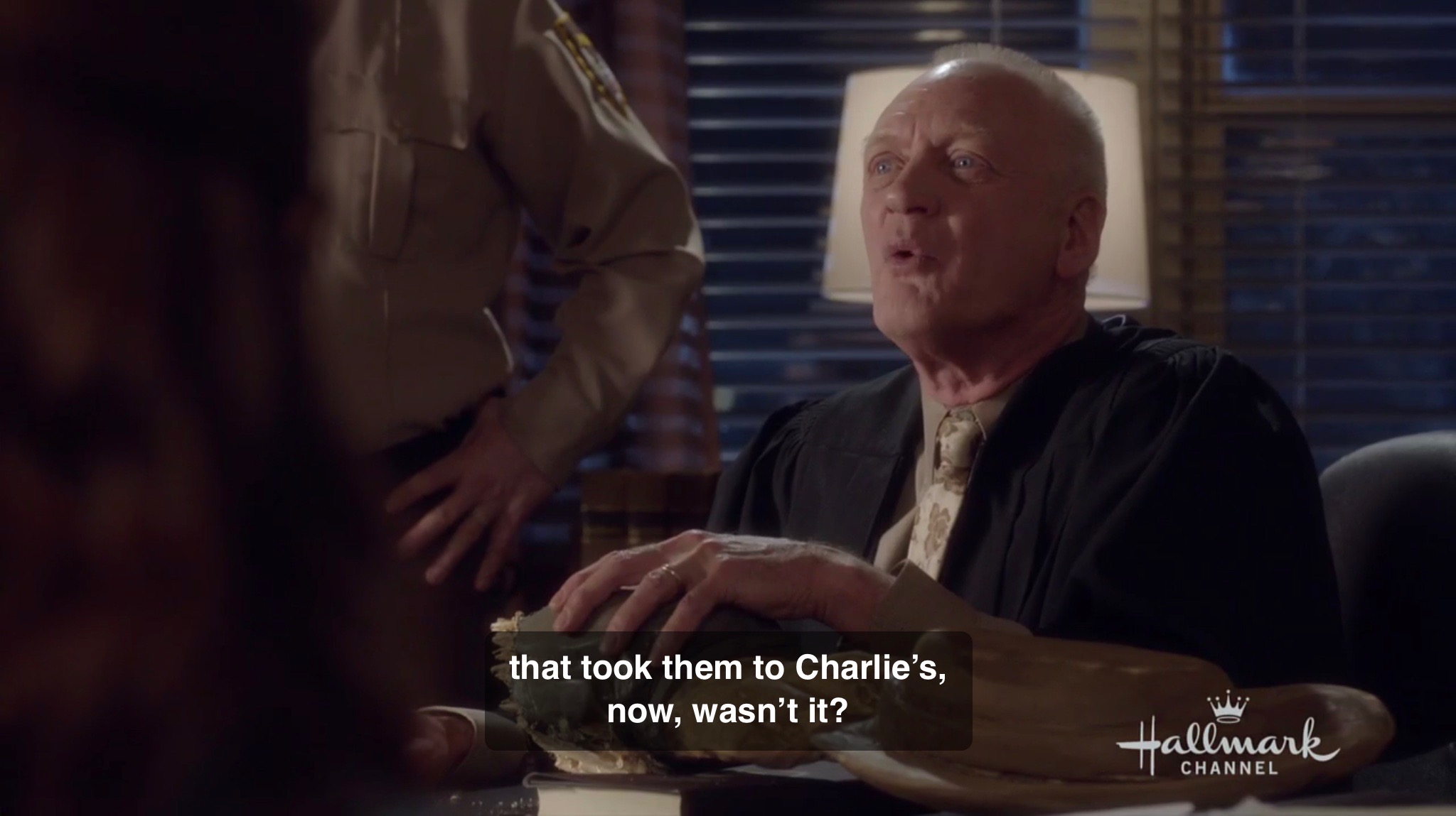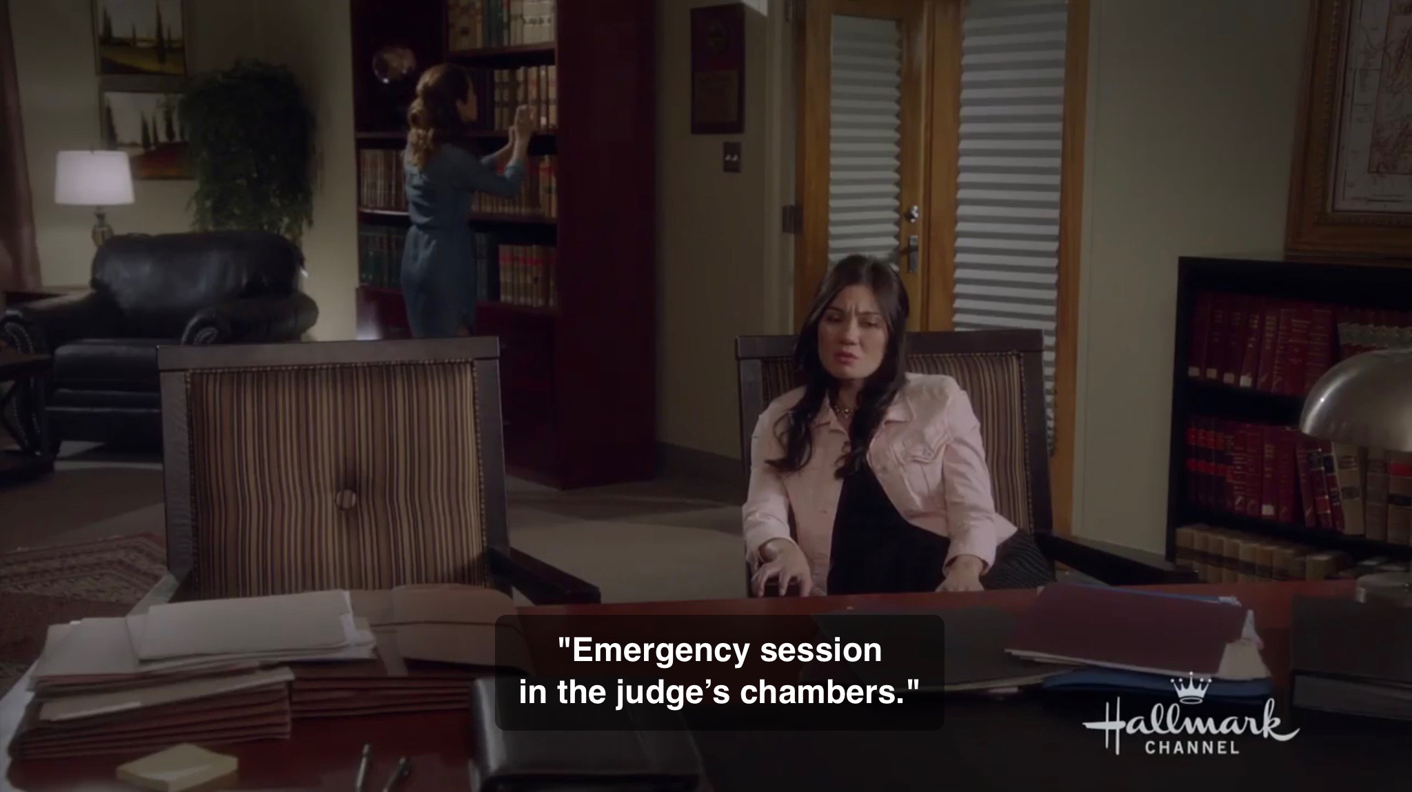 Now Julia and Sydney are dragged into the judge’s chamber for an “emergency session”. Note that Julia who is going to become a lawyer is looking at the law books on the shelf. She says, “It means they’re not sure they arrested us on the right charge and they want the judge to weigh in,” when Sydney says she doesn’t understand what an “emergency session” with the judge means. Guess what Julia is looking for on that shelf? She is looking for and finds the “Emmettsville Municipal Code”. That’s when the judge enters the room and immediately takes the book away from her telling her “this is not a library”. The judge, his deputy, and Ben follow in after him.
