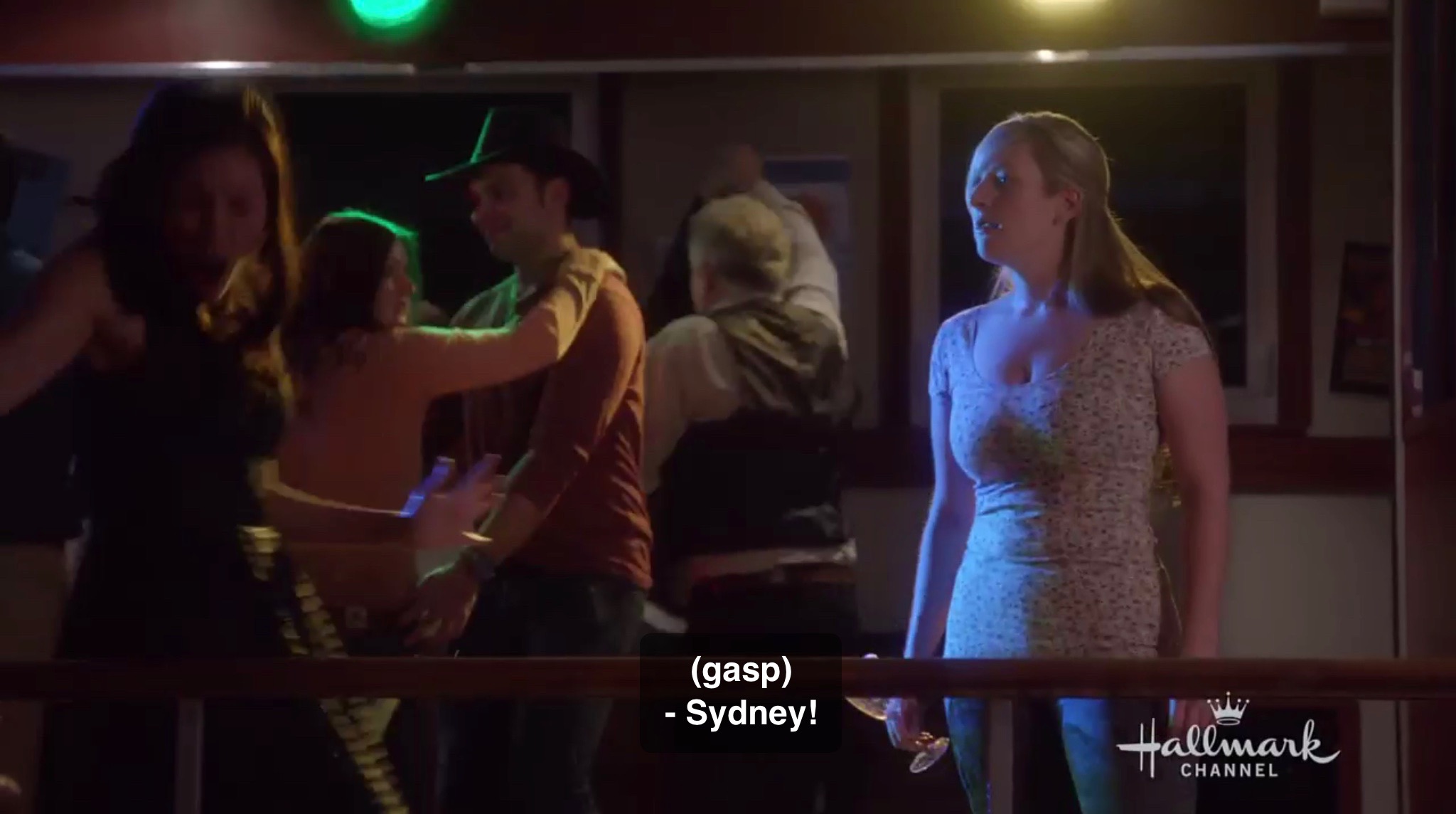 Now Sydney says, “Ok. You can insult my dancing, but not my fashion sense. I’m not the one wearing country floral in the winter.” Very restrained response to an insult that implies Sydney is a big city slut for simply wearing an expensive dress and dancing on a dance floor.