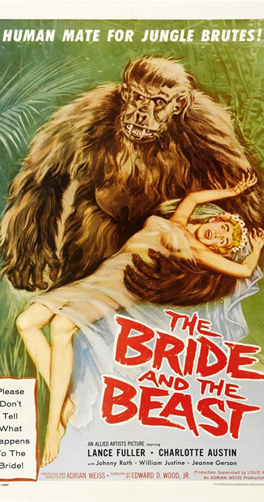 The 1958 film, The Bride and the Beast, tells the story of newlyweds Dan (Lance Fuller) and Laura Fuller (Charlotte Austin). Dan is an overly macho and chauvinistic big game hunter who is so into hunting and capturing animals that he even keeps a gorilla named Sparky in the basement of his home. I’m not really sure that’s legal and, even if it is, the logistics of keeping a gorilla in your home seem like they would be beyond the capabilities of moron like Dan. Then again, when Sparky gets loose and tries to attack Laura, Dan is forced to shoot him. So, I guess the movie was kind enough to prove my point.