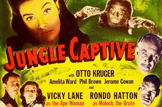 The third and final entry in Universal’s Paula Dupree/The Ape Woman series, JUNGLE CAPTIVE was released in 1945. I’m happy to report it’s a slight upgrade on JUNGLE WOMAN – by no means a classic horror movie, but certainly more enjoyable than that wretched sequel to CAPTIVE WILD WOMAN . The budget is lower-than-low, but the performances and script are far better, and it makes a good finale to the Ape Woman saga.