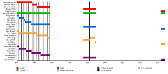 The first is obvious. I know next to nothing about Mighty Morphin Power Rangers except that they are multi-colored. Thus, Rainbow. Much like Power Rangers, the group has gone through so many different people that someone on Wikipedia put this chart together.