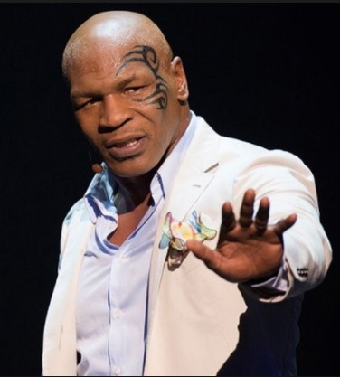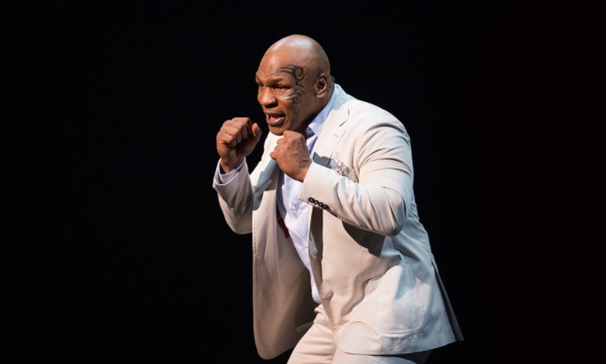 Somewhere in New York, former heavyweight champion Mike Tyson stands on a stage, wearing a white suit and talking about his life.
