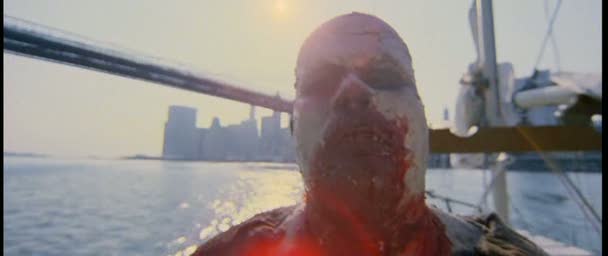 From that opening shot of a gun pointed at the camera, then blasting the head of a rising corpse, I knew I was in for a good time! After the credits roll, we see a derelict ship floating in New York harbor. The harbor patrol boards it, and find it deserted, with rotting food and supplies strewn everywhere. One of the cops investigates further, and is killed by a zombie…