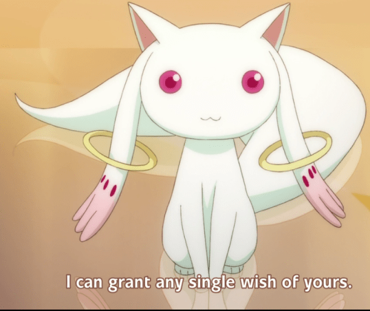 Puella Magi Madoka Magica is about very cute teen high schoolgirls who suddenly get thrust into a world of magic and science. There’s a major character that I always call an anime series’ mascot and this time it’s a creature resembling something crossed between a bunny and a siamese cat. Kyuubei (others spell it’s name Kyubey, Kyubei, QB, etc…) is a very cute creature who will grant a chosen girl any wish they want as long as they enter into a contract with it to become a Puella Magi who is a girl with magical powers to fight evil and witches.